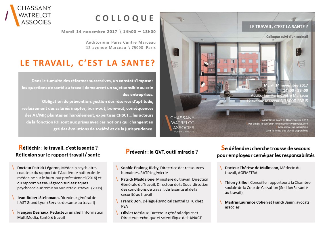 LE 14 NOVEMBRE 2017, CHASSANY WATRELOT & ASSOCIÉS ORGANISE UN COLLOQUE SUR LES PROBLÉMATIQUES RH DE SANTÉ AU TRAVAIL.
